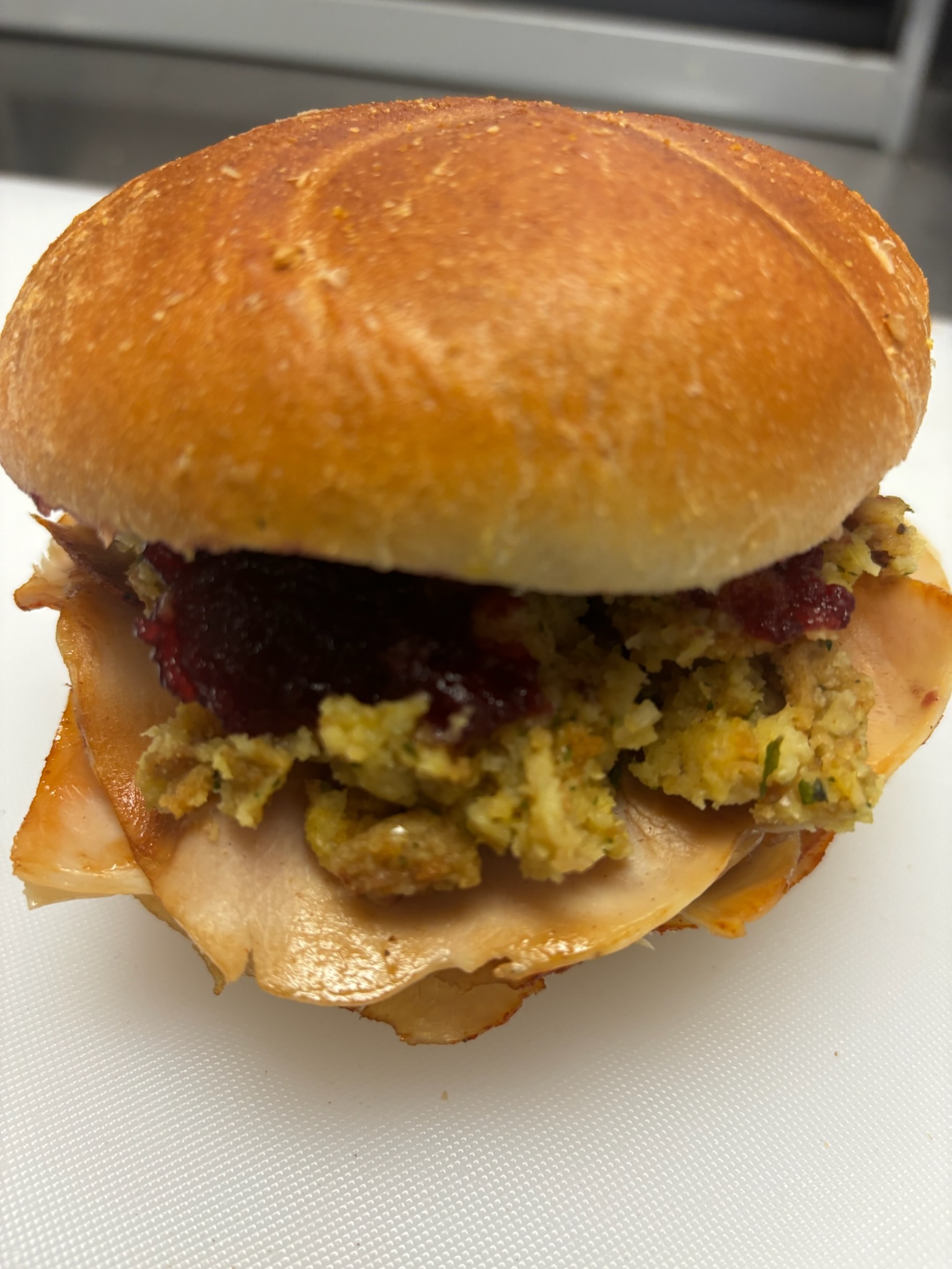 turkey, cranberry sauce, stuffing, mayo, on a roll
